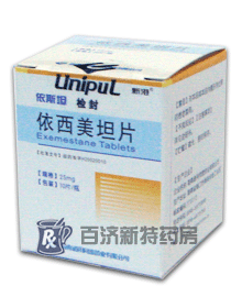 【藥代動力學】據文獻報告,絕經的健康女性口服放射標記的依西美坦后,吸收迅速,至少42%的依西美坦在胃腸道被吸收;食用高脂肪餐后,血漿中依西美坦水平上升約40%。依西美坦在各組織中廣泛分布,其血漿蛋白結合率為90%。依西美坦的代謝率廣泛,主要通過6-位亞甲基的氧化和17-位酮基還原進行代謝,代謝產物無活性或抑制芳香酶活性較弱,其代謝物主要從尿和糞中排泄,約各占40%左右,尿中排出的原形藥物低于給藥量的1%。依西美坦的平均終末半衰期為24小時。
