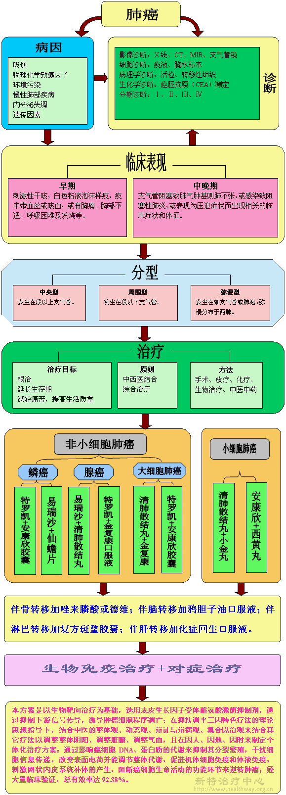肺癌概述: 肺癌是肺部最常見的惡性腫瘤,肺癌的發(fā)病率隨年齡增長而增加,40歲以后迅速上升,男性高于女性;肺癌病因尚未完全明了,認(rèn)為與吸煙、物理、化學(xué)、、環(huán)境污染、遺傳因素等有關(guān);肺癌治療必先明確診斷,常見方法有: X線、CT、磁共振、支氣管造影和細(xì)胞學(xué)檢查等;臨床將肺癌分小細(xì)胞肺癌和非小細(xì)胞肺癌兩大類;肺癌主要臨床表現(xiàn)有: 咳嗽 咳痰、消瘦、發(fā)熱等;肺癌治療是根據(jù)病人的機(jī)體狀況,病理類型、侵犯范圍和發(fā)展趨向、合理地應(yīng)用現(xiàn)有治療手段(包括:手術(shù)、放化療、生物免疫和中醫(yī)藥等),肺癌治療按TNM 分期作為制訂治療計(jì)劃和判斷生存期的依據(jù),在選擇治療方案時(shí),應(yīng)從病人全身情況、臨床病期、有無重要夾雜來綜合考慮;如小細(xì)胞肺癌首先化療,非小細(xì)胞肺癌首選外科治療。手術(shù)、放療為局部治療,化療、免疫治療、中醫(yī)藥治療為全身治療,應(yīng)綜合考慮和合理安排。肺癌治療中,由于肺癌具有癥狀出現(xiàn)較晚的臨床特點(diǎn),有 70% 的病人確診時(shí)已是晚期,為此,早預(yù)防、早診斷、早治療是控制肺癌發(fā)病率的重要措施,而改變不良生活方式則是預(yù)防肺癌的關(guān)鍵。