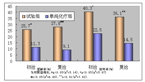 尿多酸肽聯合化療試驗組病人301例,可評價療效252例,總緩解率(CR+PR%)為26.6%(ITT:22.3%)。總好轉率為(CR+PR+MR%)38.5%(ITT:32.2%);單純化療對照組病人153例?稍u價療效126例,總緩解率10.3%(ITT:8.5%),總好轉率19.0%(ITT:15.7%)。試驗組療效顯著高于單純化療組(見表1)。其中尿多酸肽聯合化療試驗組非小細胞肺癌、原發性肝癌、乳腺癌患者的緩解率分別為41.6%、8.9%、38.5%,也明顯高于對照組(18.8%、3.8%、8.0%),而且提高到2倍以上。試驗組初治療病倒、復治病例的緩解率25.7%、27.8%,均明顯高于對照組(11.3%、9.1%),而且對復治的病人顯示出更為突出的治療效果(見圖一)
