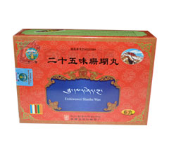 【主要成分】:珊瑚,訶子,廣木香,腦石,甘草,丁香,龍骨,紅花,鐵棒錘(制)珍珠,麝香,朱砂等25味。