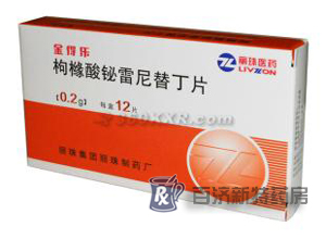 本品400mg口服后,在胃中解離成枸櫞酸鉍與雷尼替丁。其中,雷尼替丁血漿濃度峰值Cmax為453.4±119.7ng/ml;達峰時間Tmax為 2.23±0.53hr;血漿蛋白結合率為15%;吸收率和吸收度隨給藥劑量增加(至1600g)而成比例增加;血漿半衰期為2.25±0.38hr;在體內主要代謝為N-氧化物、S-氧化物、N-脫甲基代謝產物,分別占給藥劑量的4%、1%和1%;其中30%經腎臟排泄。鉍的吸收低于攝入量的1%,其吸收率和吸收度不隨劑量的增加而增加(口服RBC劑量大于800mg時),血漿半衰期為2.8~3.1h,大于99%的鉍在胃腸道中不吸收,直接排出體外。